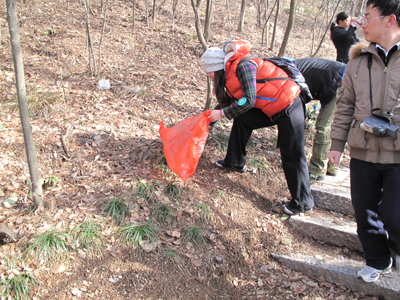 在從頭陀嶺前往紫金山天文臺參觀的途中,員工們將游客沿途丟棄在路邊的瓜皮果屑等雜物撿入隨身攜帶的環(huán)保袋內(nèi),在榜樣力量的帶動下,游客們也紛紛加入到我們集團的隊伍中來,和我們一齊撿垃圾。