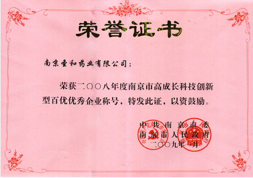 2009年2月1日上午,南京市委、市政府在南京經(jīng)濟(jì)技術(shù)開發(fā)區(qū)召開“全市工業(yè)保增長(zhǎng)促轉(zhuǎn)型動(dòng)員大會(huì)”,市委書記朱善璐、市長(zhǎng)蔣宏坤出席大會(huì),并作重要講話。會(huì)上還表彰了2008年度工業(yè)經(jīng)濟(jì)先進(jìn)單位,我公司被授予“二OO八年度南京市高成長(zhǎng)科技創(chuàng)新型百優(yōu)優(yōu)秀企業(yè)” 榮譽(yù)稱號(hào)。