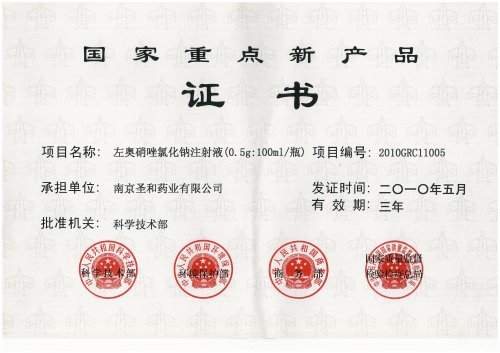 左奧硝唑氯化鈉注射液于2009年8月獲得國家食品藥品監(jiān)督管理局新藥證書及藥品注冊批件,并已獲得國家發(fā)明專利5項,國際專利2項,并獲得“2009年中國十方處方藥重磅新品”,現(xiàn)已正式上市銷售。