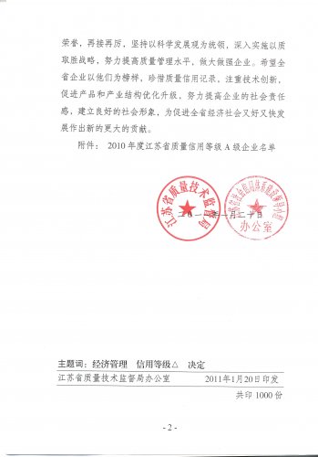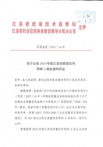 在規(guī)劃發(fā)展部和質(zhì)量部的共同努力下,我公司被江蘇省質(zhì)量技術(shù)監(jiān)督局、江蘇省社會信用體系建設(shè)領(lǐng)導小組評為《2010年度江蘇省質(zhì)量信用等級A級企業(yè)》。該榮譽將在企業(yè)名牌產(chǎn)品認定、許可證監(jiān)管、投資項目核準、債券發(fā)行審批、財政資金審核分配和出口產(chǎn)品通關(guān)等環(huán)節(jié)中發(fā)揮得到廣泛應用,對公司的誠信體系建設(shè)具有重要的意義,是對公司核心競爭力的肯定,進一步提高了公司的綜合信用等級,提升了品牌形象。